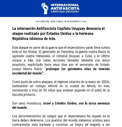 INTERNACIONAL ANTIFASCISTA CAPÍTULO URUGUAY DECLARACIÓN - MONTEVIDEO, 28 DE FEBRERO DE 2026 La Internación Antifascista Capítulo Uruguay denuncia el ataque realizado por Estados Unidos a la hermana República Islámica de Irán. Este ataque es parte de la guerra que el imperialismo yanki lleva contra todo el Sur Global. El genocidio en Palestina, la guerra contra Rusia, la agresión contra Venezuela, el criminal bloqueo a Cuba, y el último ataque a Irán, son todas acciones llevadas adelante con único propósito, explicitado hace unos días por el secretario de Estado yanqui Marco Rubio: "prolongar los quinientos años de dominio occidental del mundo". Como parte de estos ataques, el régimen sionista de la mano de EEUU, bombardeó un colegio infantil en la ciudad de Minab, en Irán, asesinando a más de 50 niñas que estaban jugando en el patio de la escuela primaria. Son unos monstruos, Israel y Estados Unidos, son la única amenaza del mundo. Los derramamientos de sangre que el imperialismo ha regado en la tierra deben detenerse. Los pueblos del mundo debemos unirnos para contrarrestar esta barbarie y construir un futuro de respeto a las diferencias y los acuerdos internacionales. La dictadura mundial que impone Estados Unidos y su alianza atlántica está en decadencia, por eso su agresividad. El momento de detenerla y superarla, es ahora. La humanidad se merece otras formas de vida. Ante este difícil momento que vive el pueblo iraní. Declaramos nuestro profundo rechazo a los ataques del eje genocida, y brindamos toda nuestra solidaridad al pueblo y gobierno de Irán, que sabemos va a resistir con firmeza en defensa de su derecho a la soberanía y la autodeterminación La paz en el mundo no se va a conseguir mientras no sea derrotado este modelo de odio y rapiña de los países imperialistas. Es el momento de unir a todo el Sur Global bajo una misma bandera, derrotar al imperialismo y construir una comunidad mundial de futuro compartido. Por la paz mundial y contra el imperialismo! Por la justa lucha del pueblo iraní! Viva la Revolución Islámica y todo el eje de la resistencia! Patria o muerte. Venceremos! https://x.com/IRANinURUGUAY/status/2028132969081131067?s=20