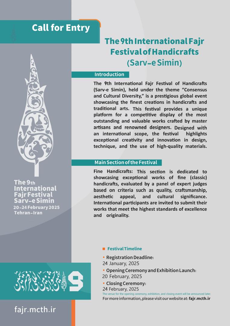 El 9º Festival Internacional de Artesanía Fajr (Sarv-e Simin), que se celebrará bajo el tema “Diversidad y convergencia cultural”, se llevará a cabo del 20 al 24 de febrero de 2025 en Teherán, Irán.
