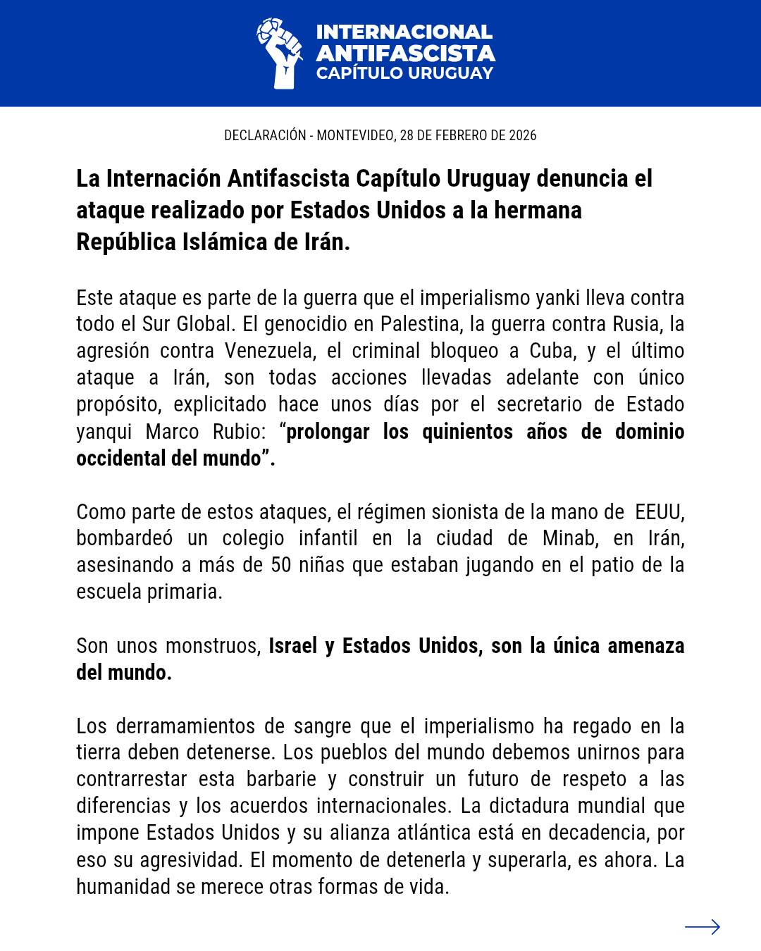 La Internación Antifascista Capítulo Uruguay denuncia el ataque realizado por Estados Unidos a la hermana República Islámica de Irán.