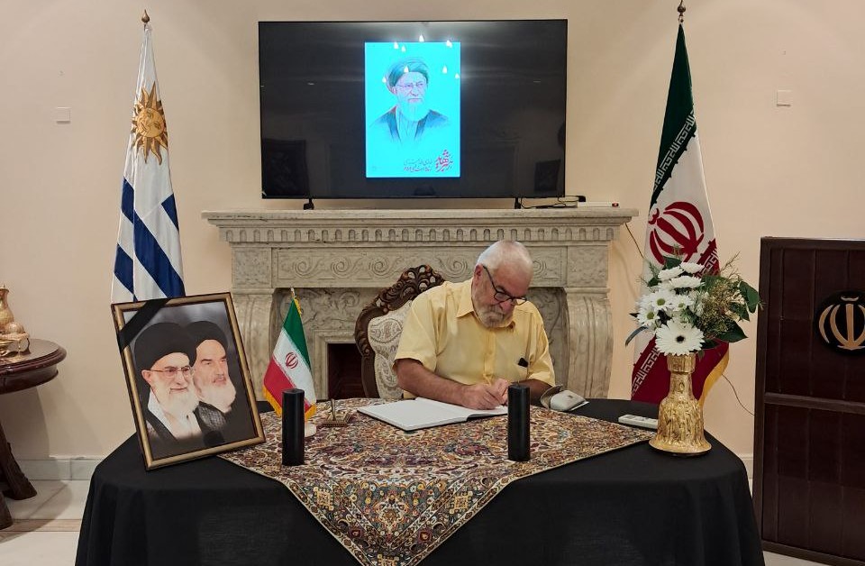 دفتر یادبود شهادت رهبر معظم انقلاب اسلامی آیت‌الله سید علی خامنه‌ای در جریان حملات جنایتکارانه ایالات متحده آمریکا و رژیم صهیونیستی، در محل سفارت جمهوری اسلامی ایران در مونته ویدئو توسط مقامات اروگوئه، سفرا و دیپلماتهای خارجی مقیم و حامیان و دوستداران انقلاب اسلامی ایران در روزهای چهارشنبه و پنج شنبه 13 و 14 اسفند ماه 1404 امضاء شد.