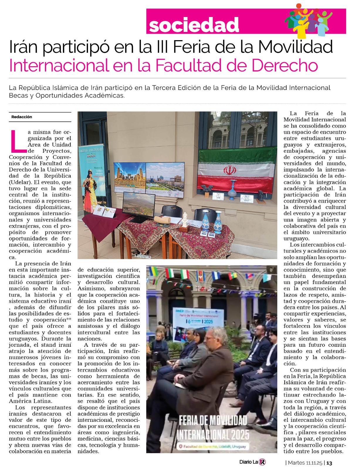 گزارش روزنامه لارپوبلیکای اروگوئه از مشارکت فعال سفارت ج.ا.ایران در مونته ویدئو در سومین دوره نمایشگاه بینالمللی «تبادل دانشجویی» در دانشکده حقوق دانشگاه رپوبلیکا