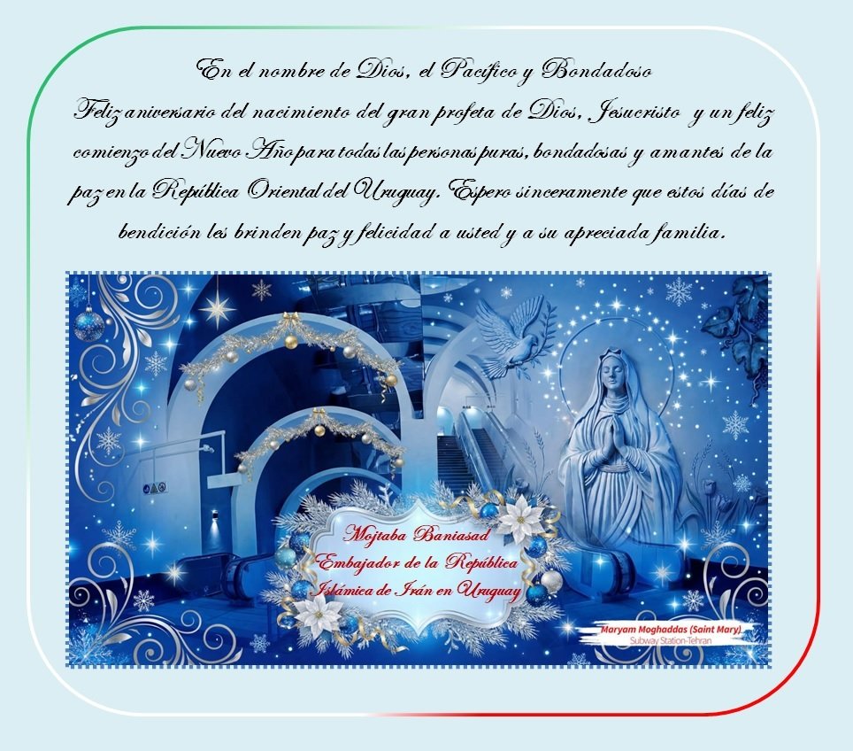 میلاد پیامبر بزرگ الهی، حضرت عیسی مسیح (ع) و آغاز سال نو بر همه انسان‌های پاک سرشت، نیک‌اندیش و صلح دوست در جمهوری شرقی اروگوئه مبارک باد.